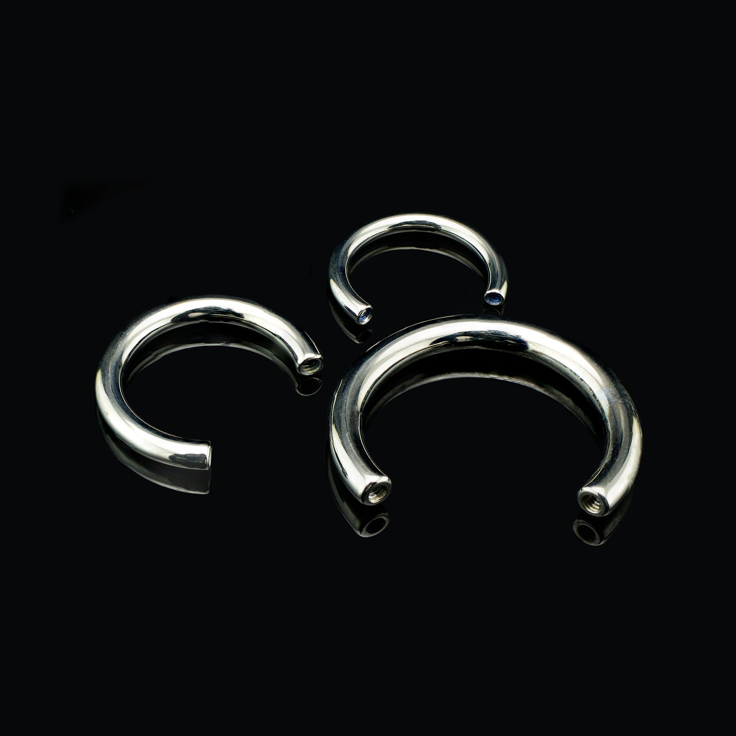 Three silver colors circular shaped bars with a small opening at the bottom for threaded ends to be attached. Set on a black background.