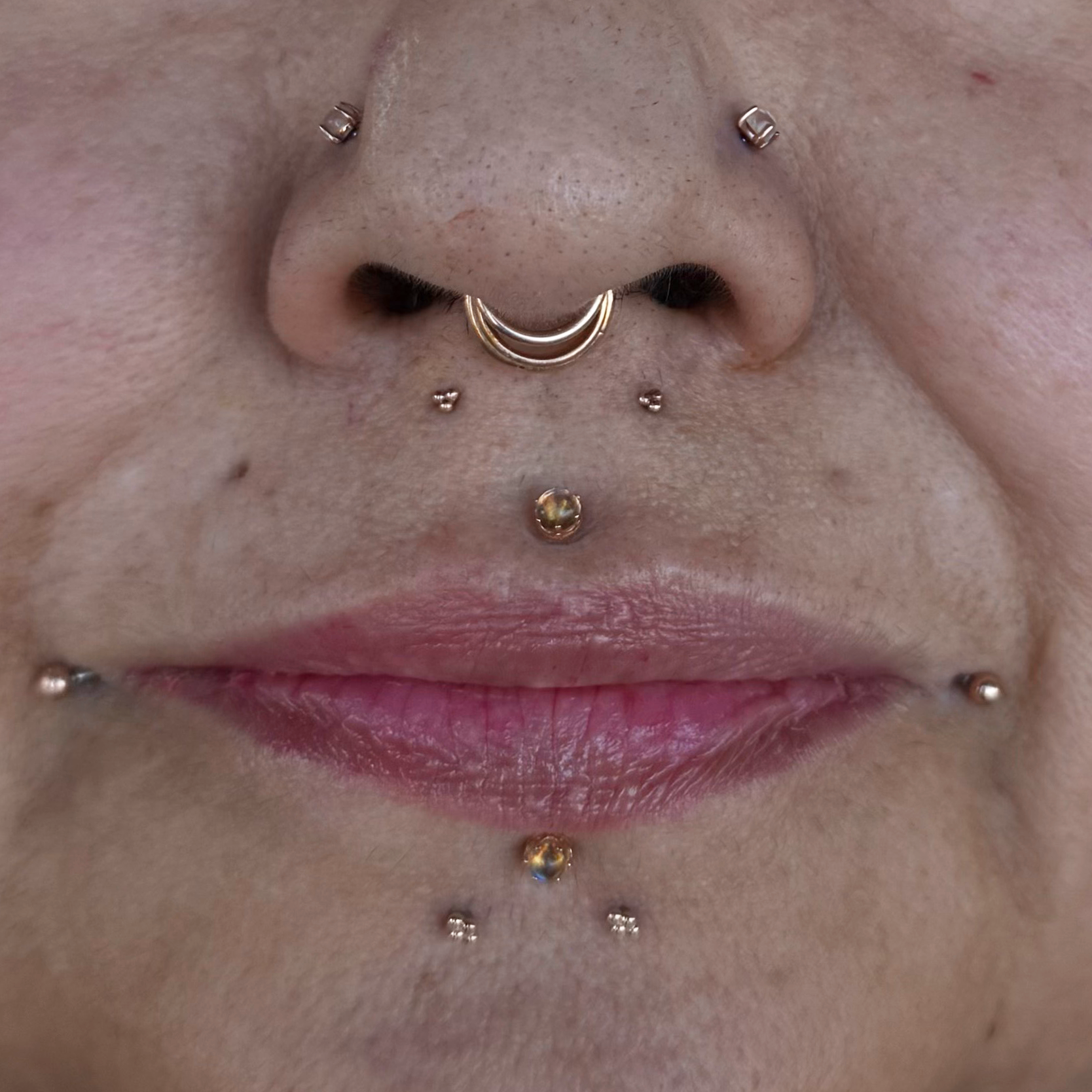 Flat Piercing with Standard 3 Bead by Joe at High Priestess in Eugene, Oregon.              Upper lip piercings with Mini 3 Beads by Diane and Ivy at Deep Roots in Seattle, Washington.