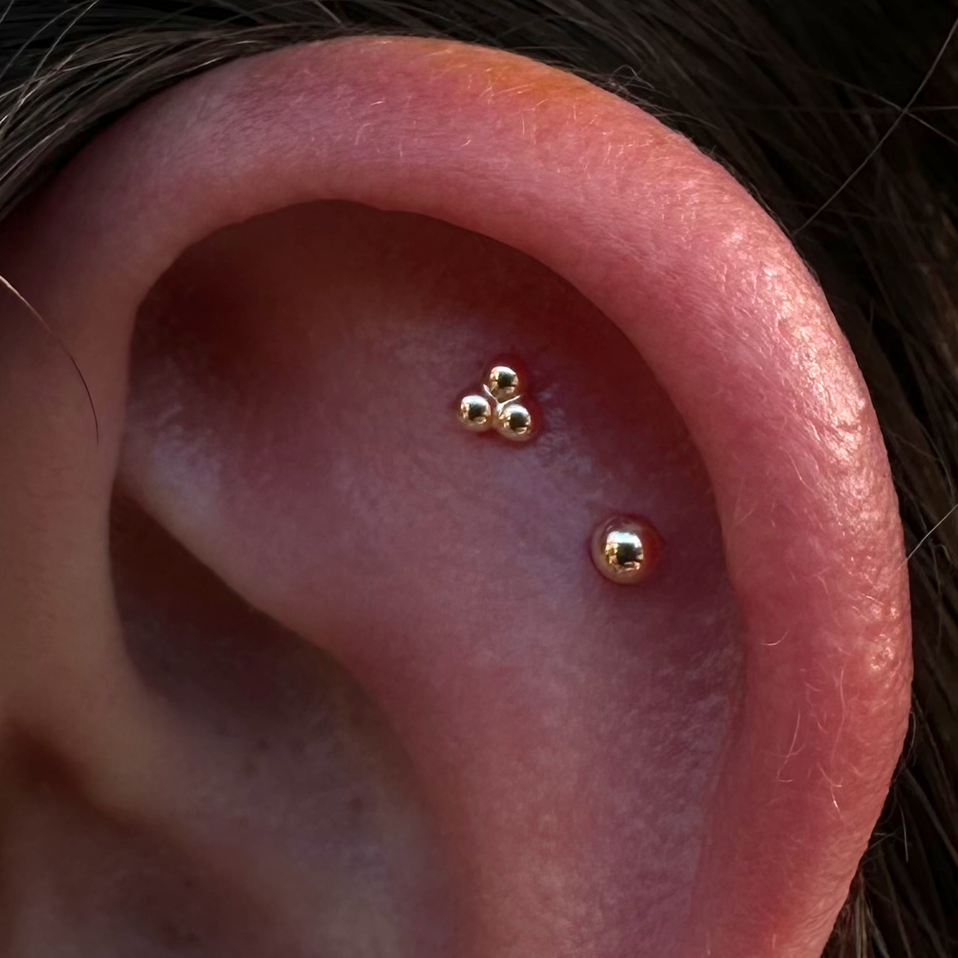 A piece of solid yellow gold body jewelry set on a black background. This photo offers a side view of the piece. This design consists of three small balls sawdered together in a triangular shape.